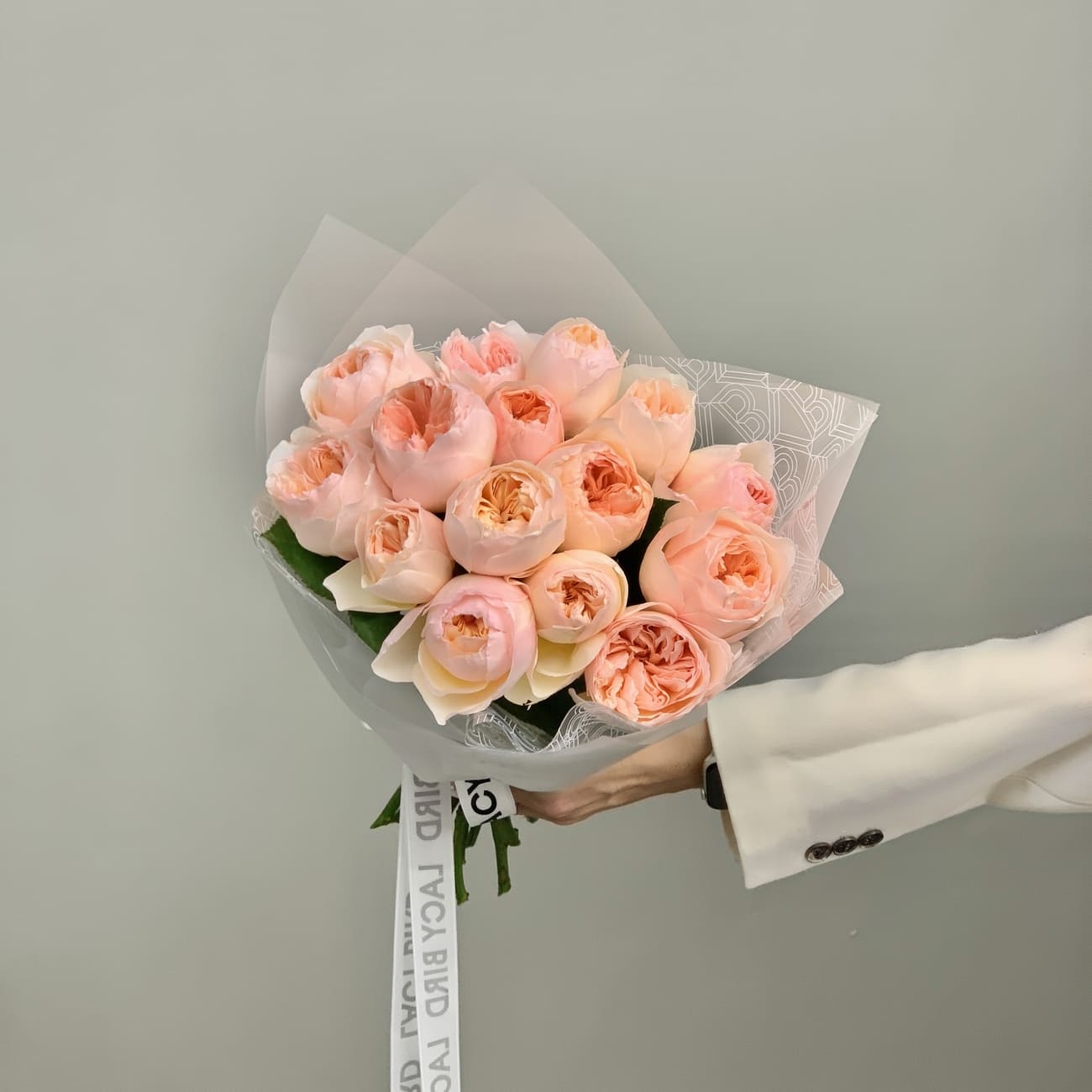 Свежие цветы от Lacy Bird доставляются в фирменной упаковке, которую необходимо снять при установке в вазу. Не срезайте ленту, связывающую букет для сохранения формы.