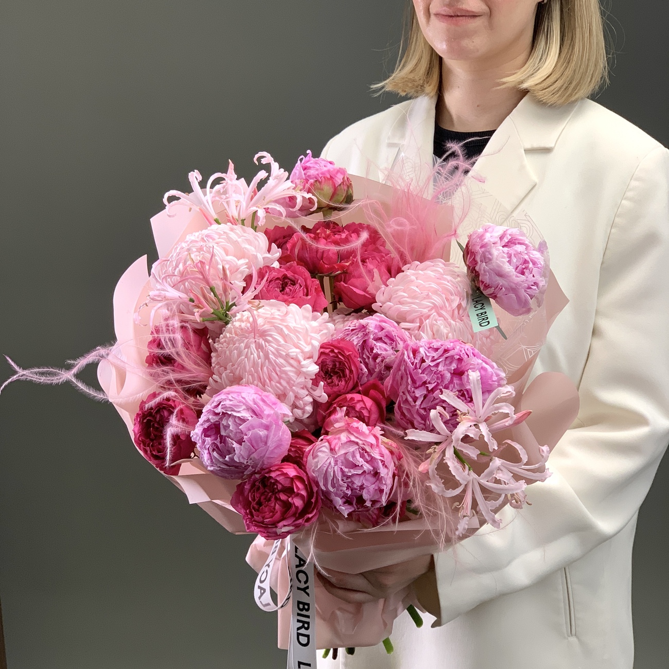 Свежие цветы от Lacy Bird доставляются в фирменной упаковке, которую необходимо снять при установке в вазу. Не срезайте ленту, связывающую букет для сохранения формы.