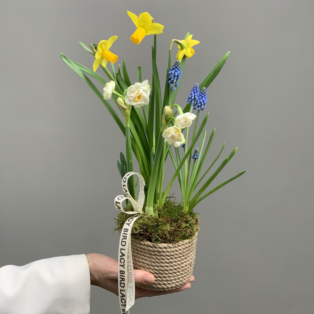 Свежие цветы от Lacy Bird доставляются в фирменной упаковке, которую необходимо снять при установке в вазу. Не срезайте ленту, связывающую букет для сохранения формы.