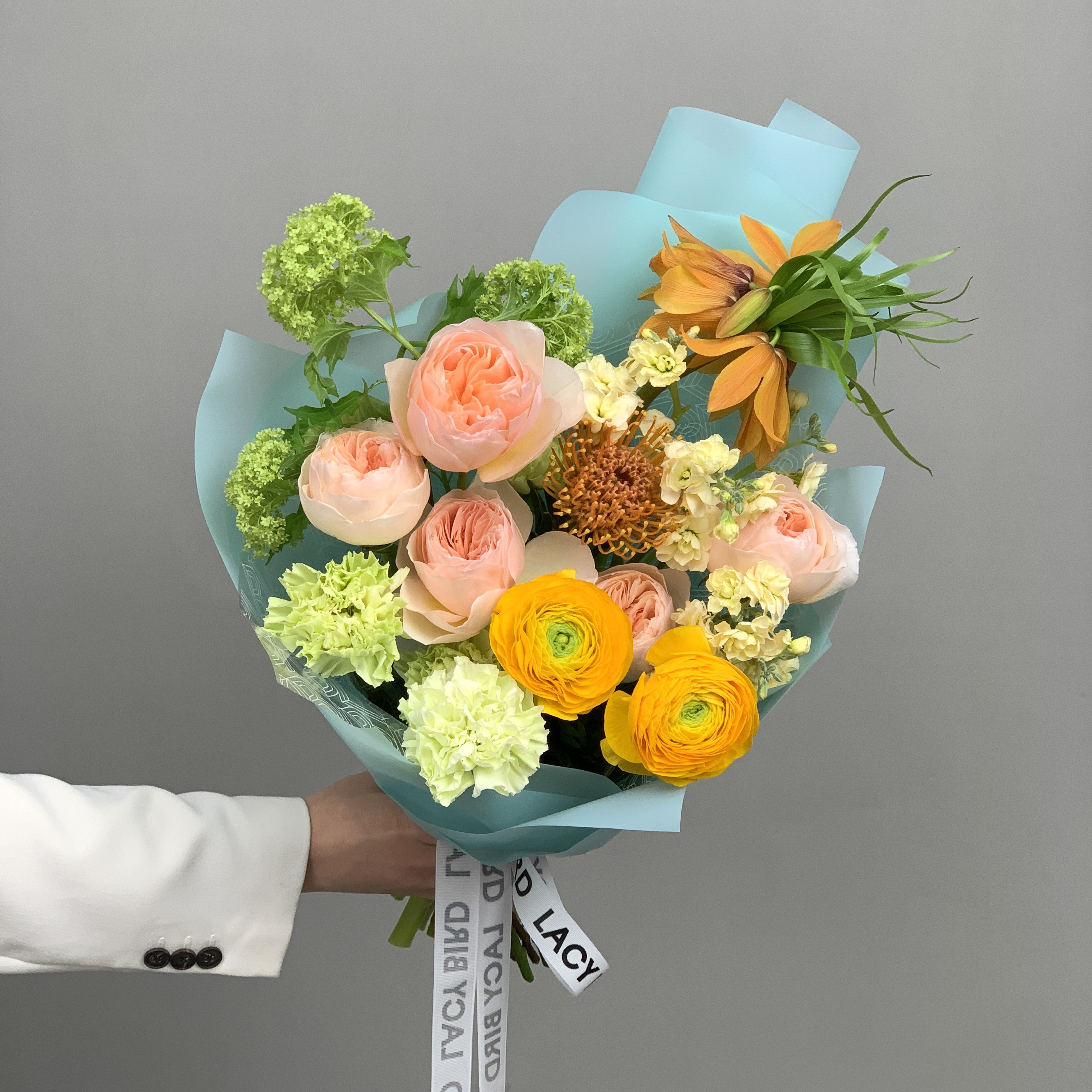 Свежие цветы от Lacy Bird доставляются в фирменной упаковке, которую необходимо снять при установке в вазу. Не срезайте ленту, связывающую букет для сохранения формы.