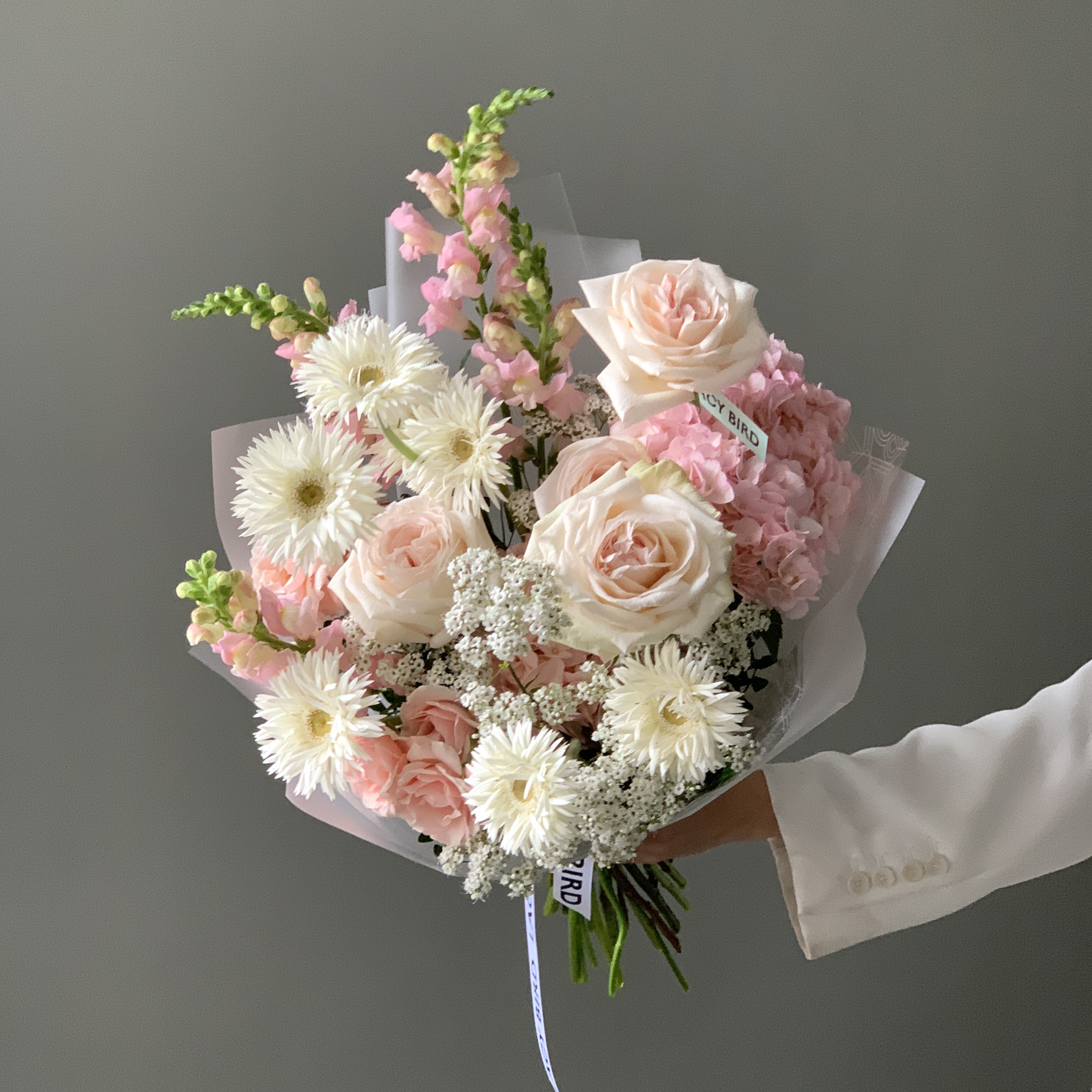 Свежие цветы от Lacy Bird доставляются в фирменной упаковке, которую необходимо снять при установке в вазу. Не срезайте ленту, связывающую букет для сохранения формы.