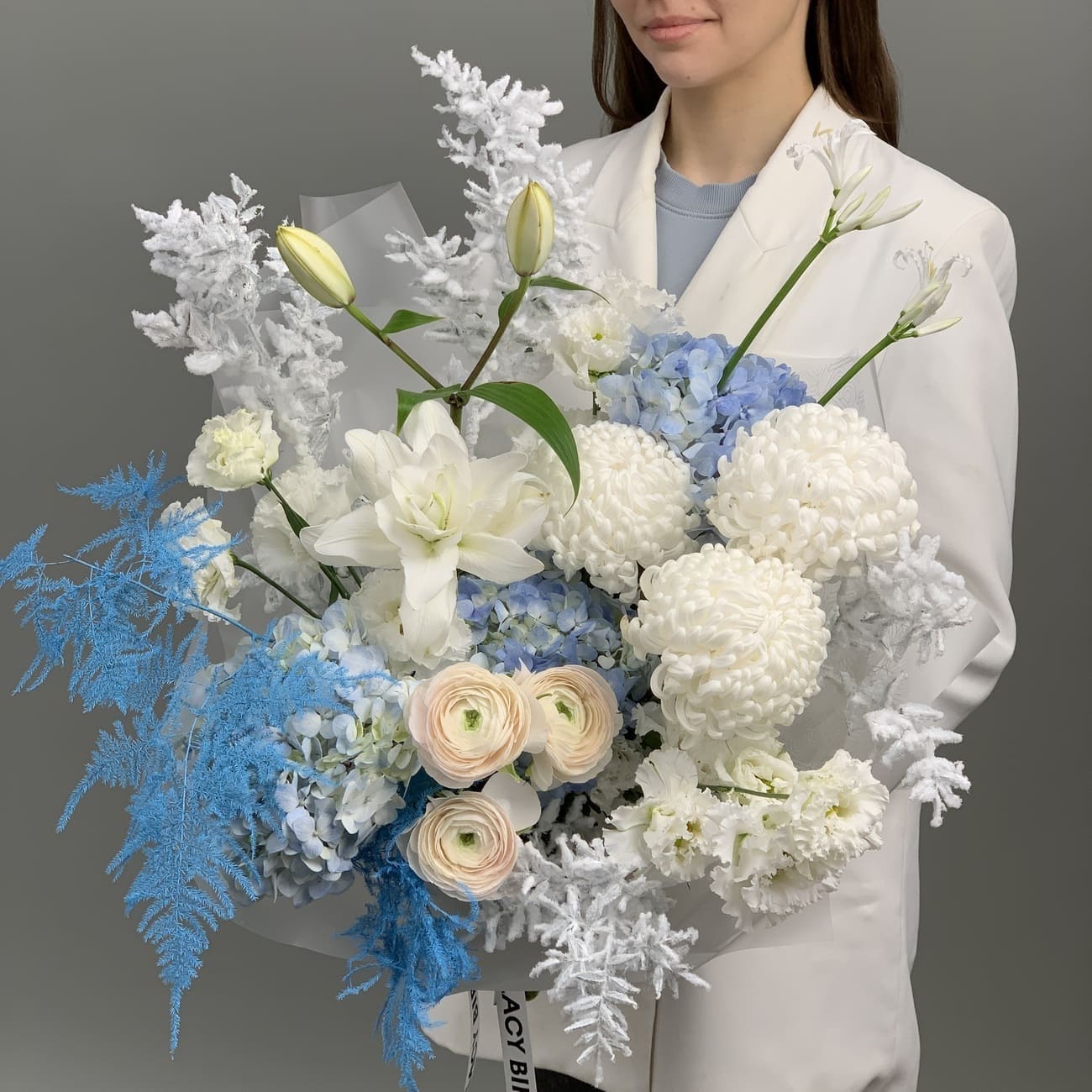 Свежие цветы от Lacy Bird доставляются в фирменной упаковке, которую необходимо снять при установке в вазу. Не срезайте ленту, связывающую букет для сохранения формы.