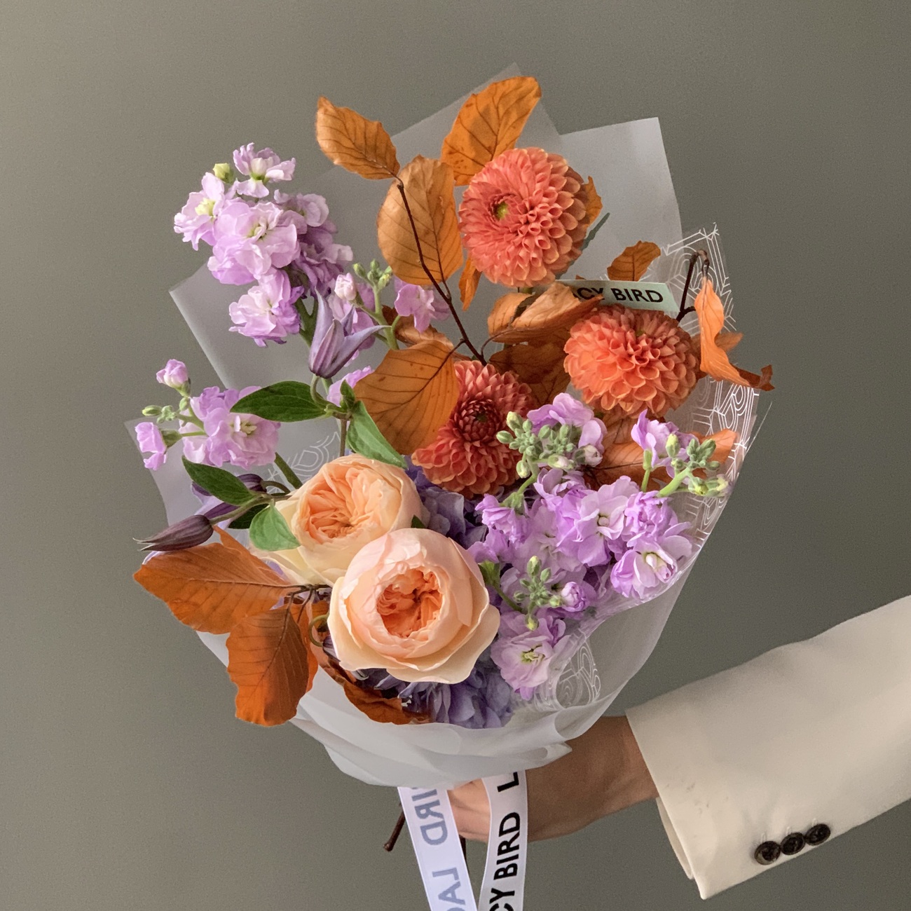 Свежие цветы от Lacy Bird доставляются в фирменной упаковке, которую необходимо снять при установке в вазу. Не срезайте ленту, связывающую букет для сохранения формы.