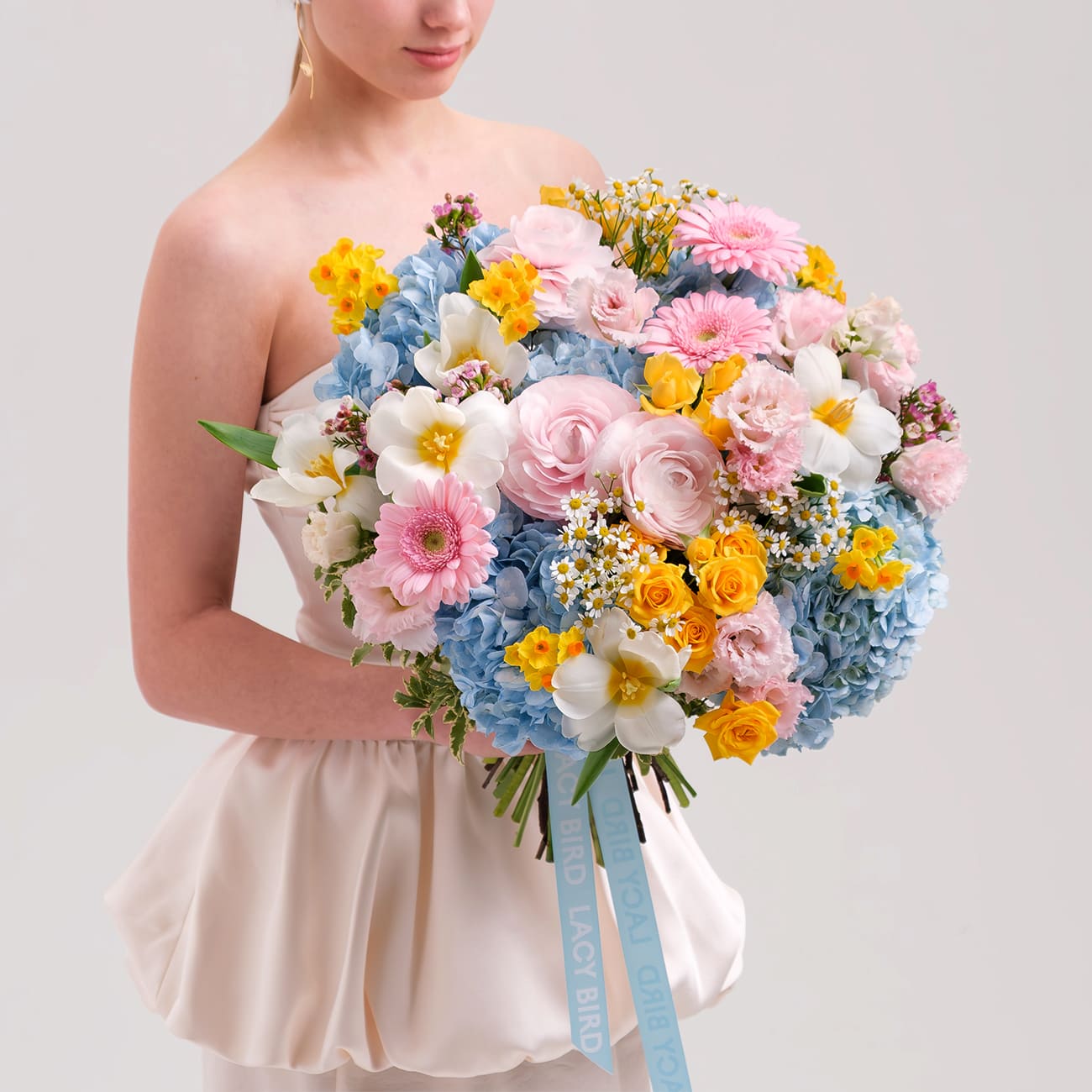 Свежие цветы от Lacy Bird доставляются в фирменной упаковке, которую необходимо снять при установке в вазу. Не срезайте ленту, связывающую букет для сохранения формы.
