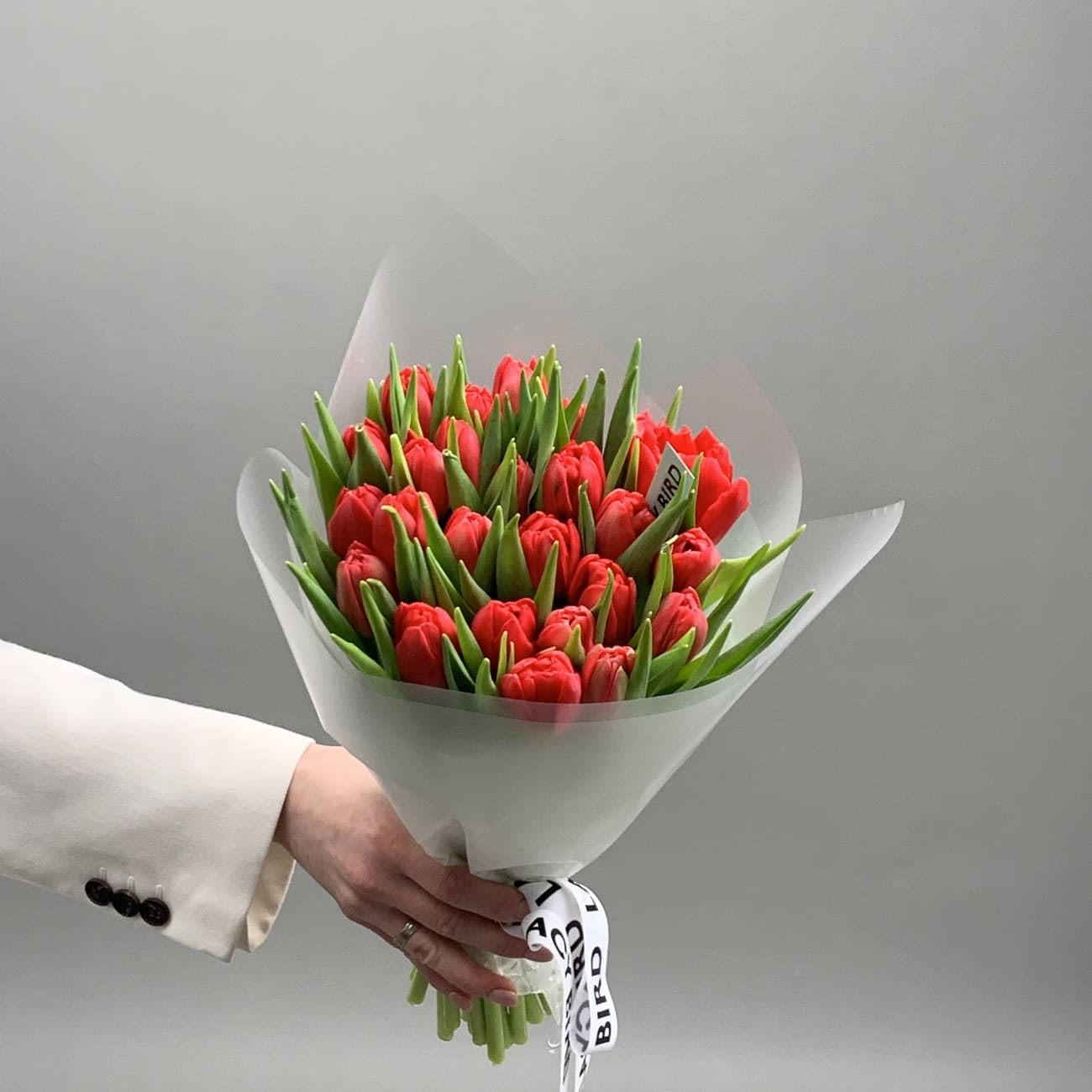 Свежие цветы от Lacy Bird доставляются в фирменной упаковке, которую необходимо снять при установке в вазу. Не срезайте ленту, связывающую букет для сохранения формы.