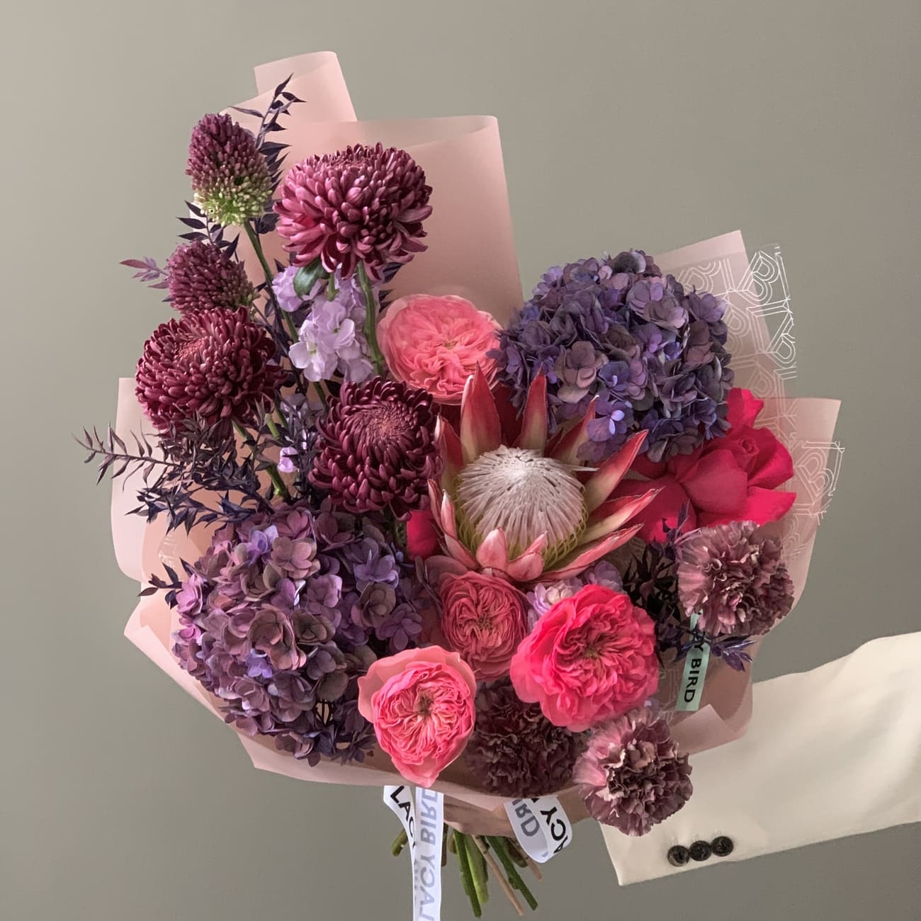 Свежие цветы от Lacy Bird доставляются в фирменной упаковке, которую необходимо снять при установке в вазу. Не срезайте ленту, связывающую букет для сохранения формы.