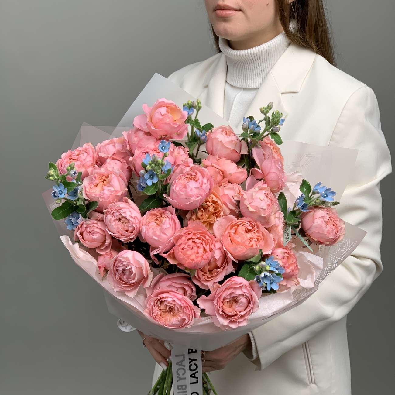 Свежие цветы от Lacy Bird доставляются в фирменной упаковке, которую необходимо снять при установке в вазу. Не срезайте ленту, связывающую букет для сохранения формы.