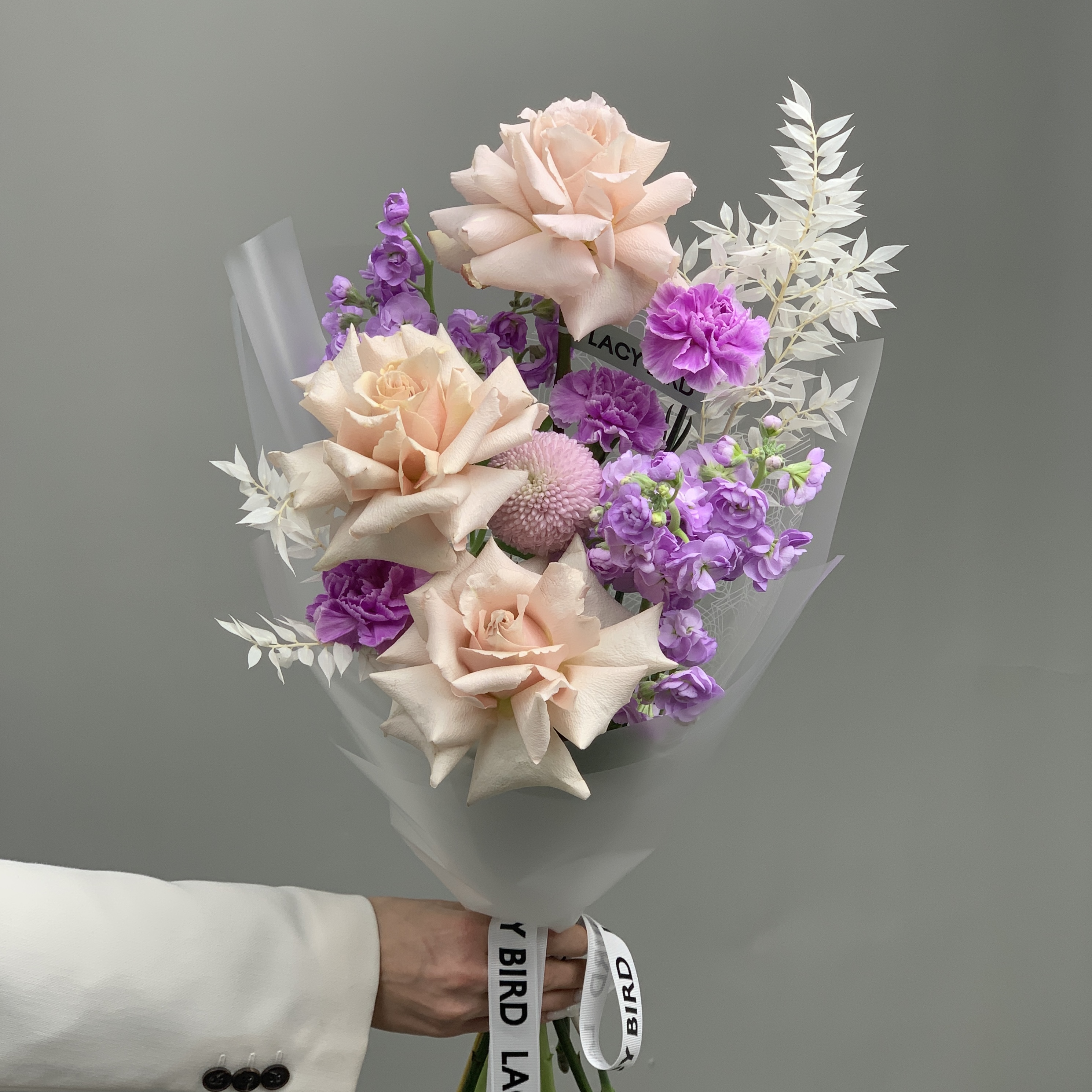 Свежие цветы от Lacy Bird доставляются в фирменной упаковке, которую необходимо снять при установке в вазу. Не срезайте ленту, связывающую букет для сохранения формы.