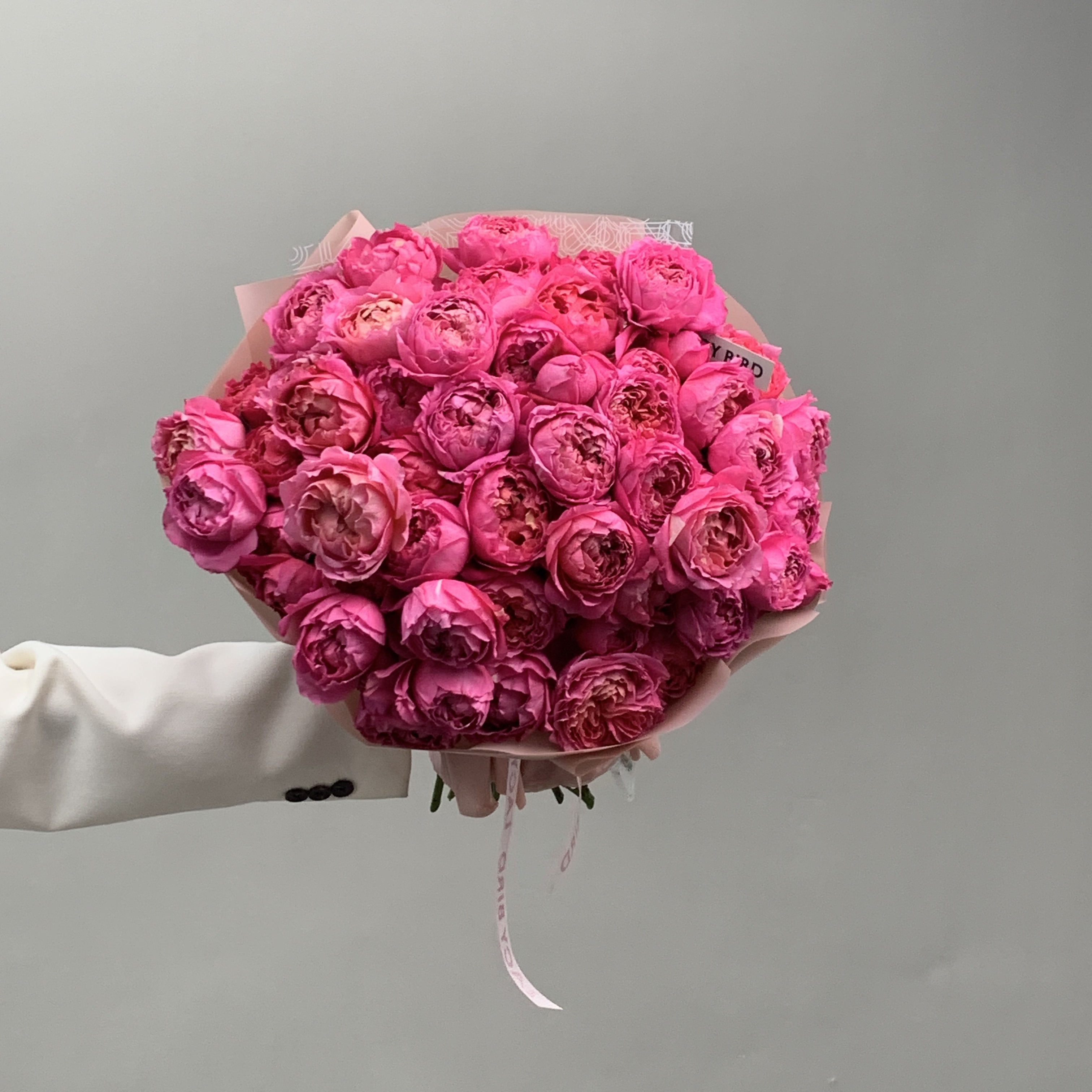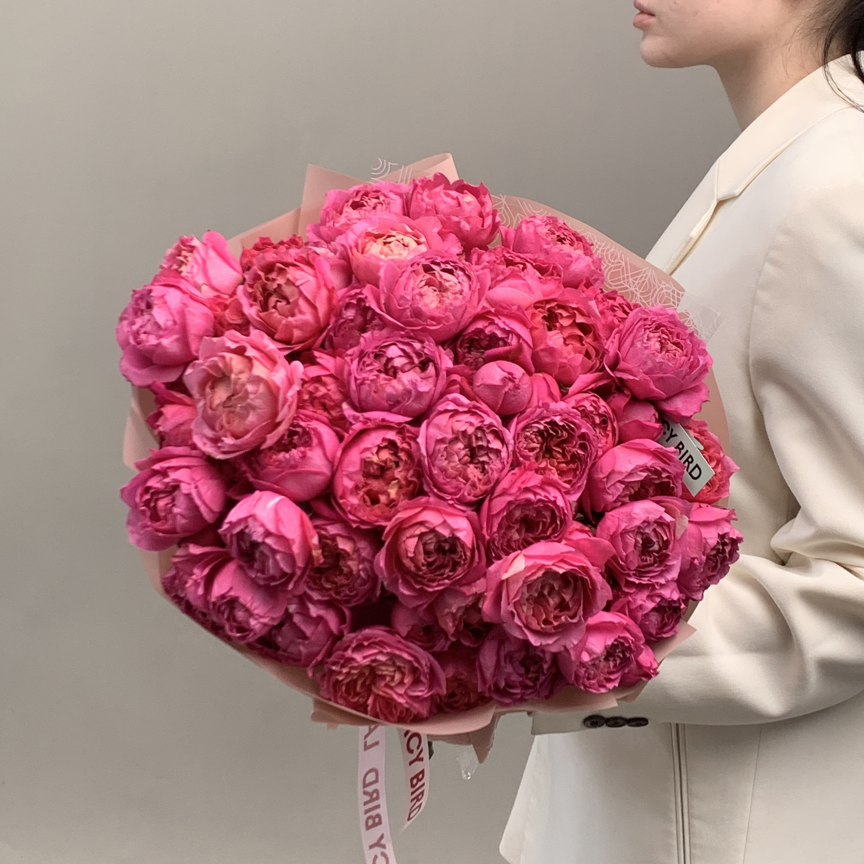 Свежие цветы от Lacy Bird доставляются в фирменной упаковке, которую необходимо снять при установке в вазу. Не срезайте ленту, связывающую букет для сохранения формы.