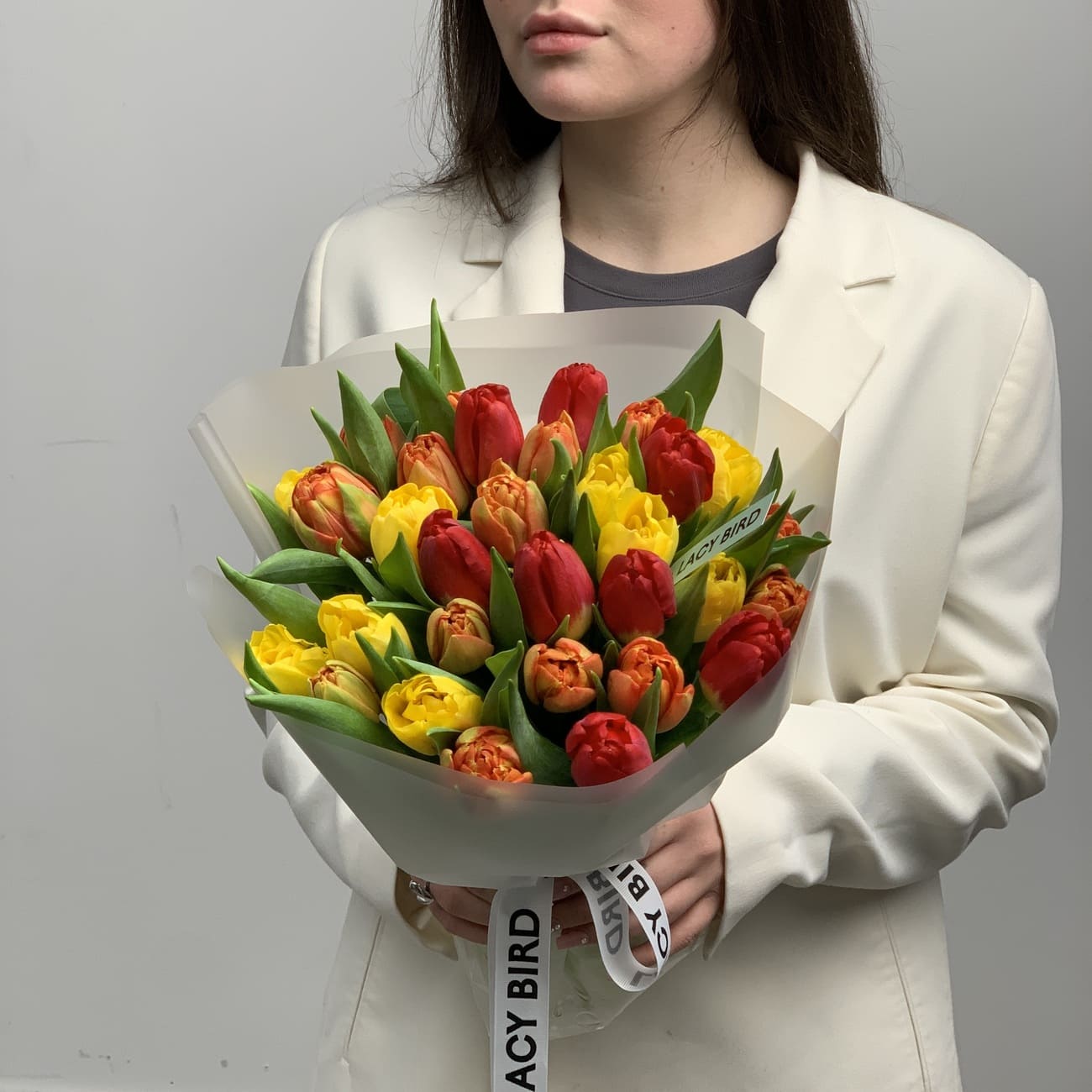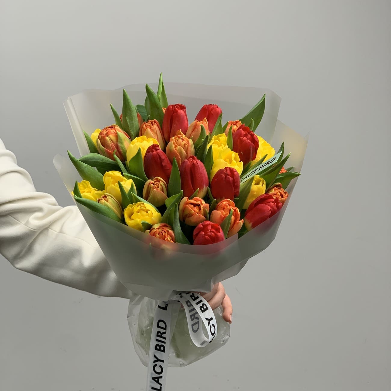 Свежие цветы от Lacy Bird доставляются в фирменной упаковке, которую необходимо снять при установке в вазу. Не срезайте ленту, связывающую букет для сохранения формы.