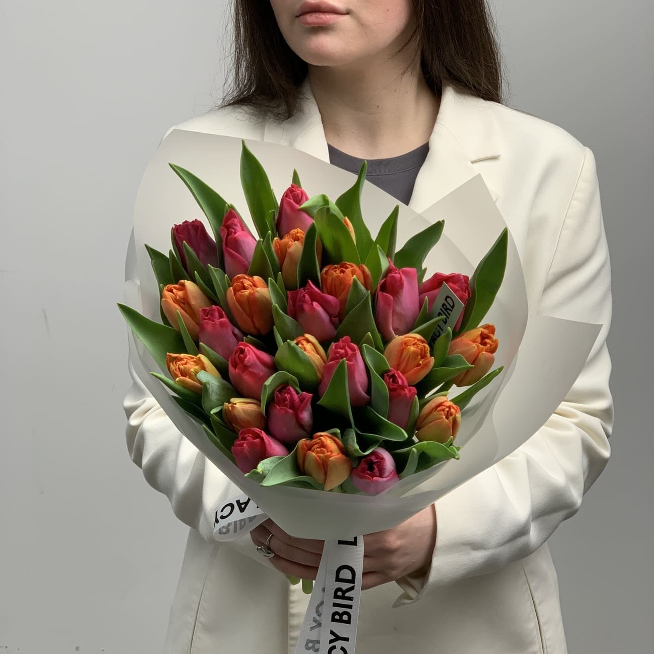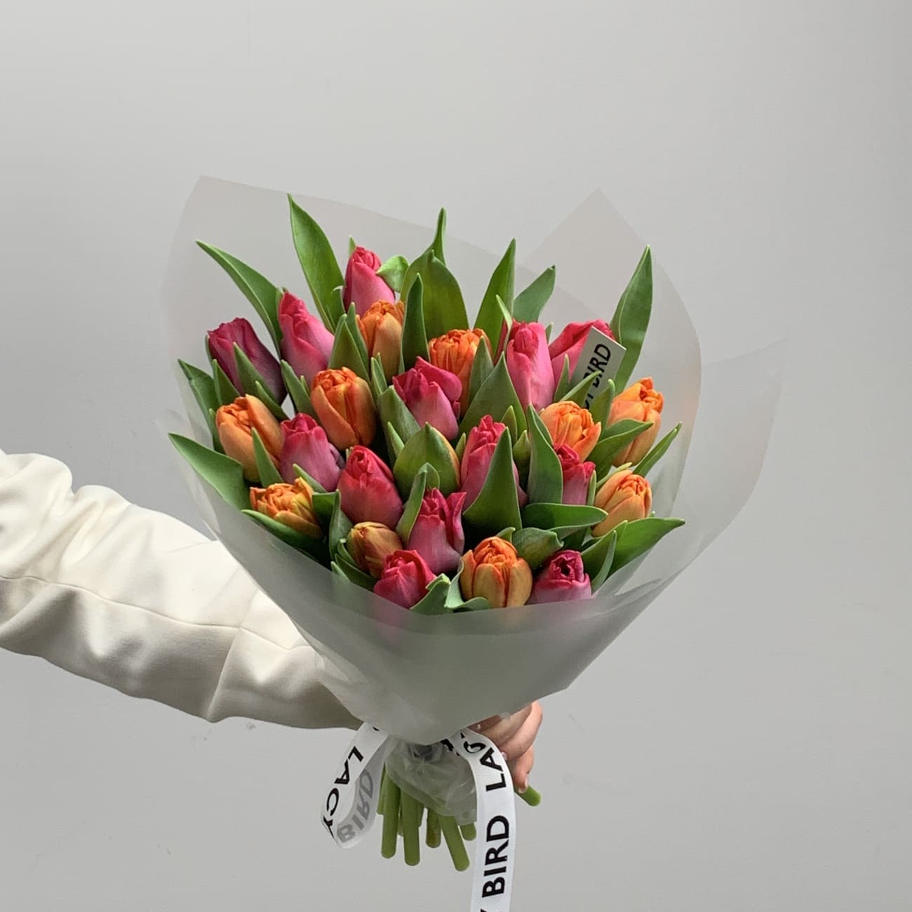 Свежие цветы от Lacy Bird доставляются в фирменной упаковке, которую необходимо снять при установке в вазу. Не срезайте ленту, связывающую букет для сохранения формы.