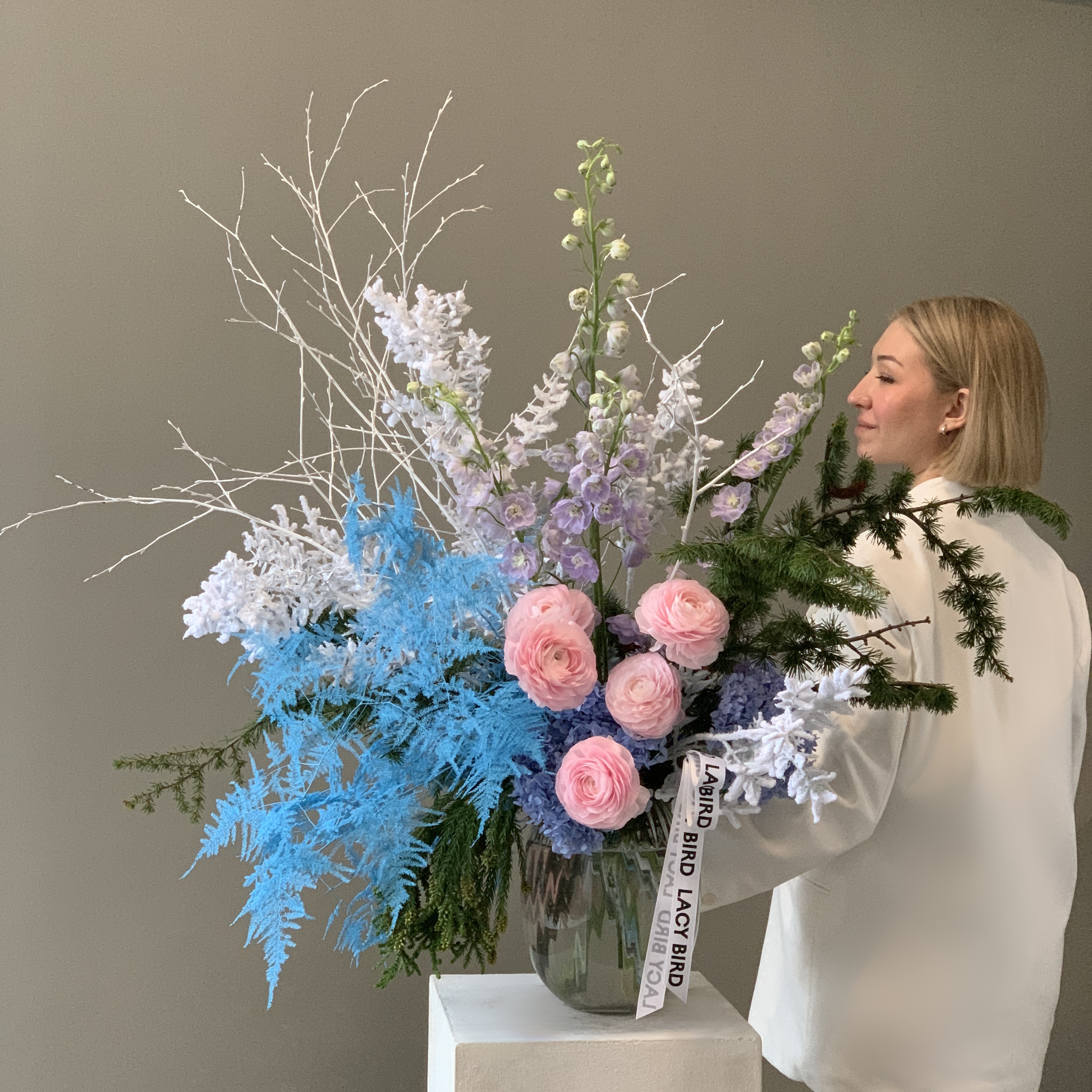 Свежие цветы от Lacy Bird доставляются в фирменной упаковке, которую необходимо снять при установке в вазу. Не срезайте ленту, связывающую букет для сохранения формы.