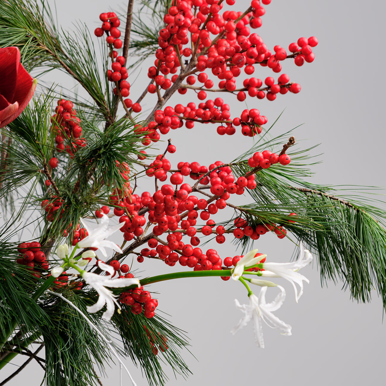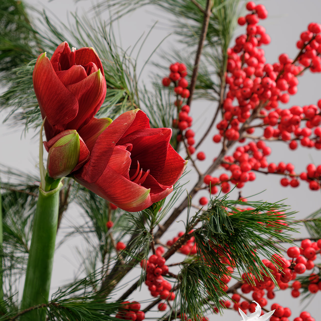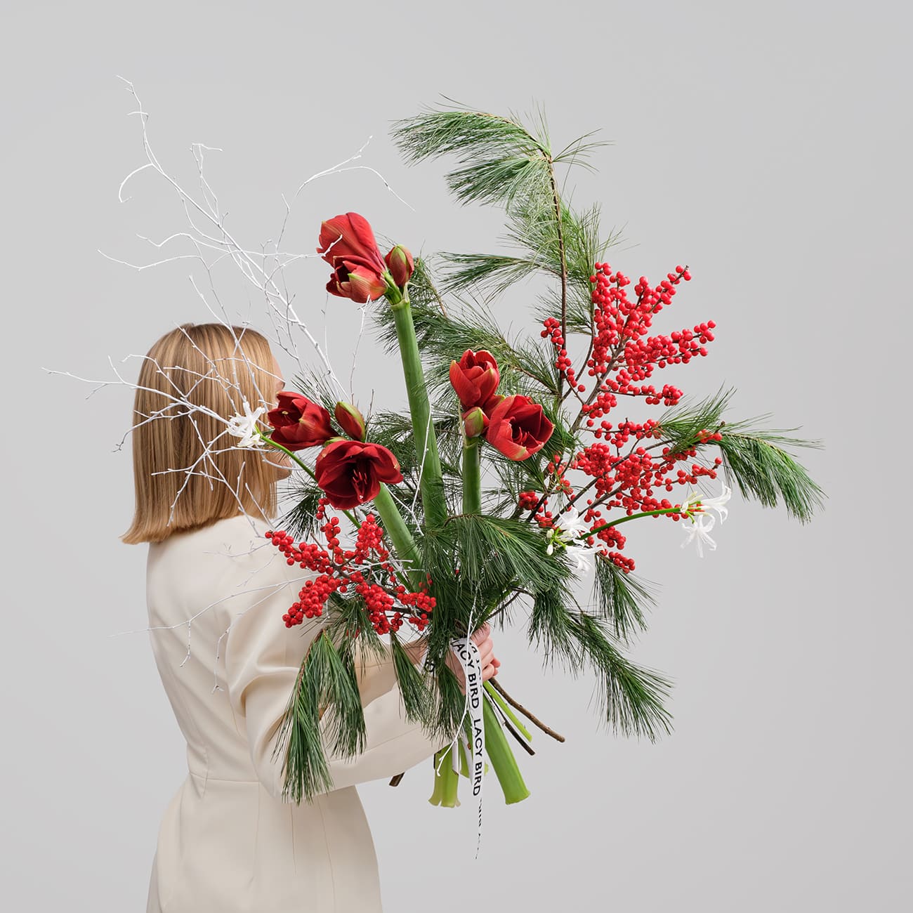 Зимняя охапка «Запах зимы» — это яркое сочетание насыщенно красных амариллисов и забелленных веток березы, дополненных хвойными ветвями пинуса и илекса, создающими атмосферу зимнего леса. Тонкие белые ветви добавляют легкости и контраста, подчеркивая изысканность композиции. Этот букет воплощает в себе дух праздника и свежесть зимнего утра, идеально подходя для тех, кто ценит уникальность и природное изящество.