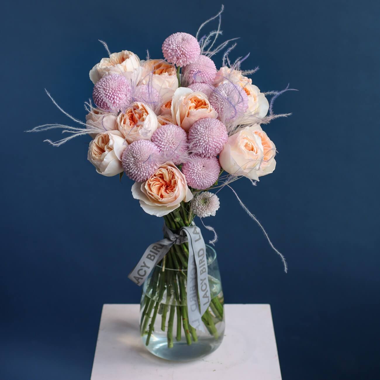 The fresh flowers from Lacy Bird are delivered in original packaging. Remove the packaging and place the flowers in a vase. We recommend not cutting the ribbon tying the flowers to keep the shape of the bouquet.
