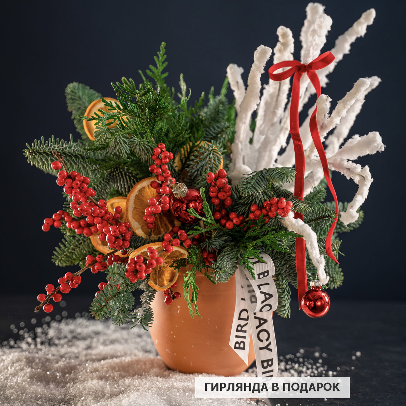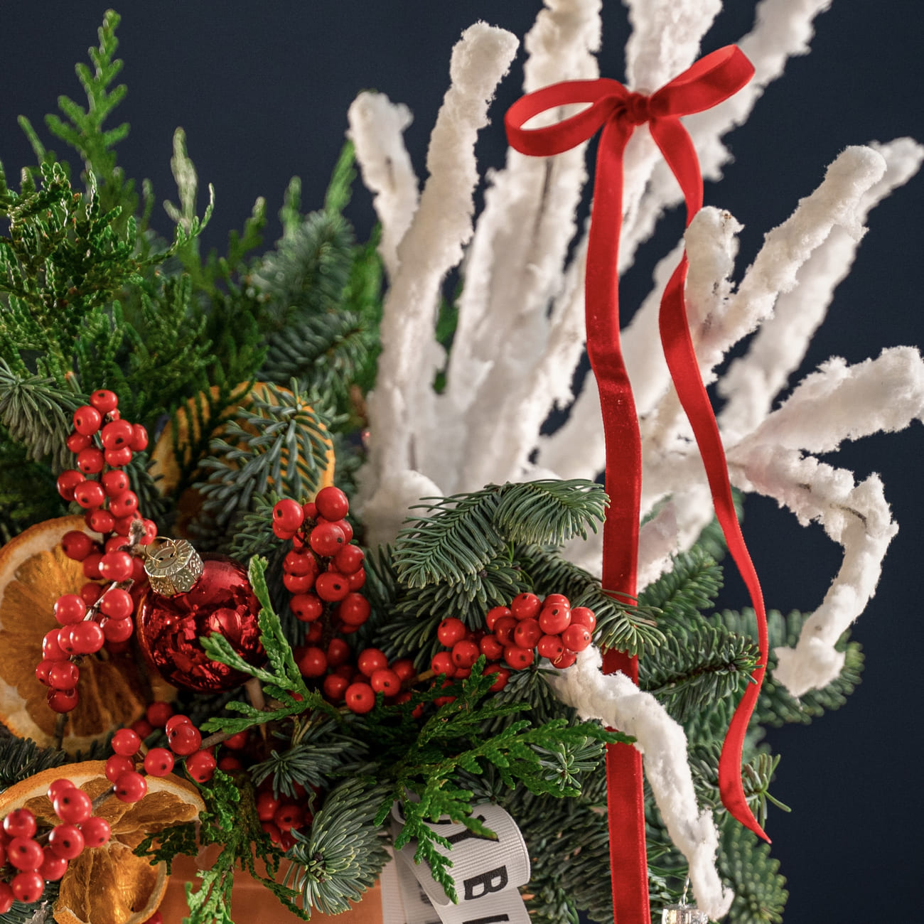 Композиция "Зимняя сказка" подарит тепло и праздничный уют вашему дому. Натуральные хвойные ветви, яркие красные ягоды и засушенные апельсиновые дольки создают гармонию зимнего леса и рождественского тепла. Белоснежные ветви, добавляют ощущение сказочного невесомого мороза. Красная бархатная лента придает особую атмосферу праздника. Это идеальное украшение для создания волшебного новогоднего интерьера, наполненного ароматами зимней природы.